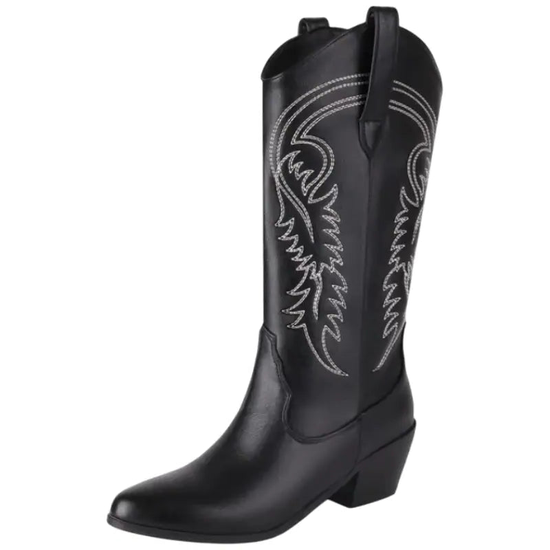 Fabriquées artisanalement en simili vegan de qualité supérieure, ces bottes à bouts pointus et talons biseautés sont décorées de motifs western traditionnels.